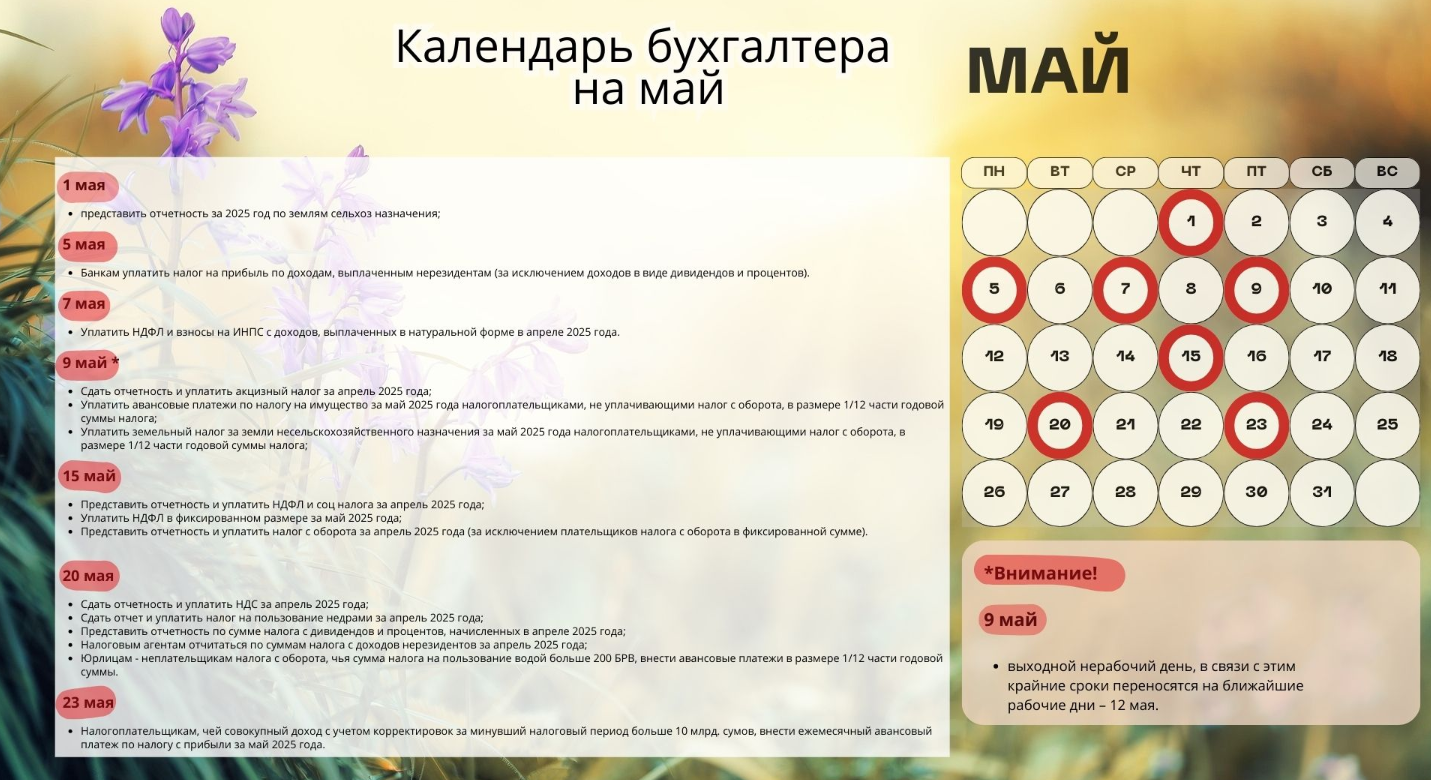 - Налогоплательщикам, чей совокупный доход с учетом корректировок за минувший налоговый период больше 10 млрд. сумов, внести ежемесячный авансовый платеж по налогу с прибыли за май 2025 года.