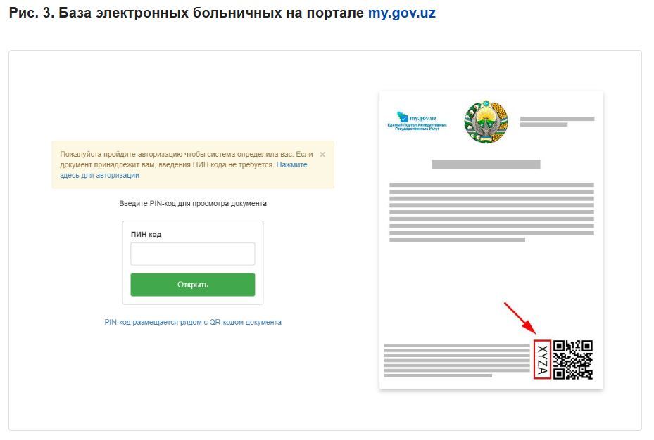 Шаг 1. При считывании QR-кода вы перейдете в базу электронных больничных на портале my.gov.uz или на платформу Министерства здравоохранения, если работник получил распечатку в медучреждении.