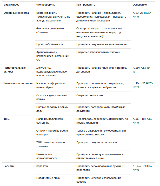 Коротко о том как проводить инвентаризации разных видов активов эксперты привели в таблице ниже: