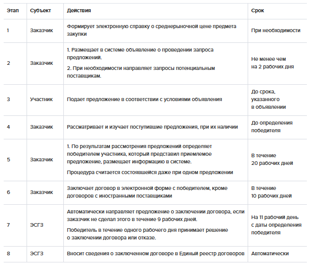 Для проведения закупки путем запроса предложений заказчик размещает объявление на два рабочих дня. После окончания приема предложений заказчику дается 20 рабочих дней на выбор подходящего предложения и победителя. Затем в течение 10 рабочих дней заказчик заключает договор с победителем торгов.