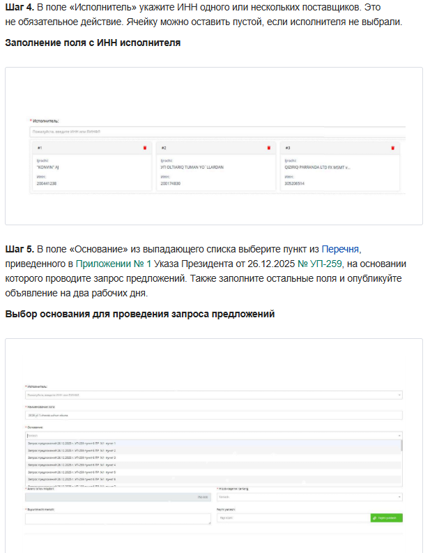 С 1 января 2026 в Узбекистане вводится новый конкурентный вид закупки — запрос предложений по Указу Президента Республики Узбекистан от 26.12.2025 № УП-259. В рекомендации — как проводить закупку путем запроса предложений. Узнаете, какие товары, работы, услуги там закупать — получите полный перечень. По схеме разберетесь, в каком порядке проводить новую закупочную процедуру. Заберете пошаговый алгоритм закупки и наглядные скриншоты по порталу xarid.uzex.uz, которые помогут провести закупку с первой попытки.
