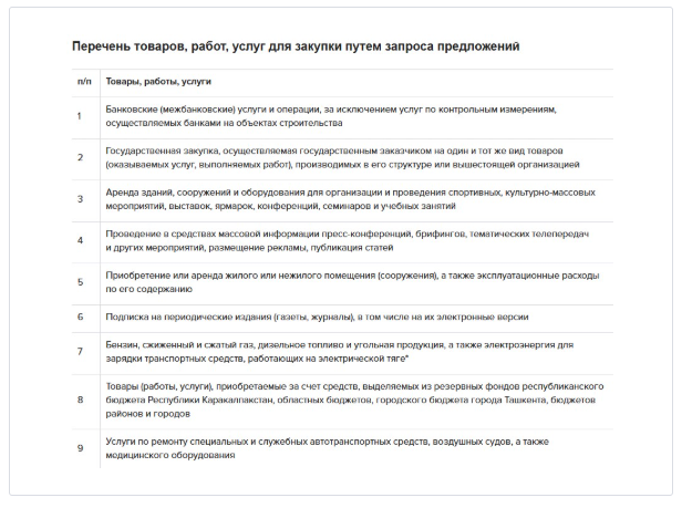Запрос предложений — конкурентный вид закупок, в котором заказчик размещает объявление в ЭСГЗ и выбирает наиболее оптимальное ценовое предложение. Путем запроса предложений заказчик может закупить 27 отдельных товаров, работ, услуг (Прил. № 1, утв. Указом Президента Республики Узбекистан от 26.12.2025 № УП-259). В их числе такие предметы закупки, как банковские услуги, ГСМ, аренда, ремонт автотранспорта и другие.
