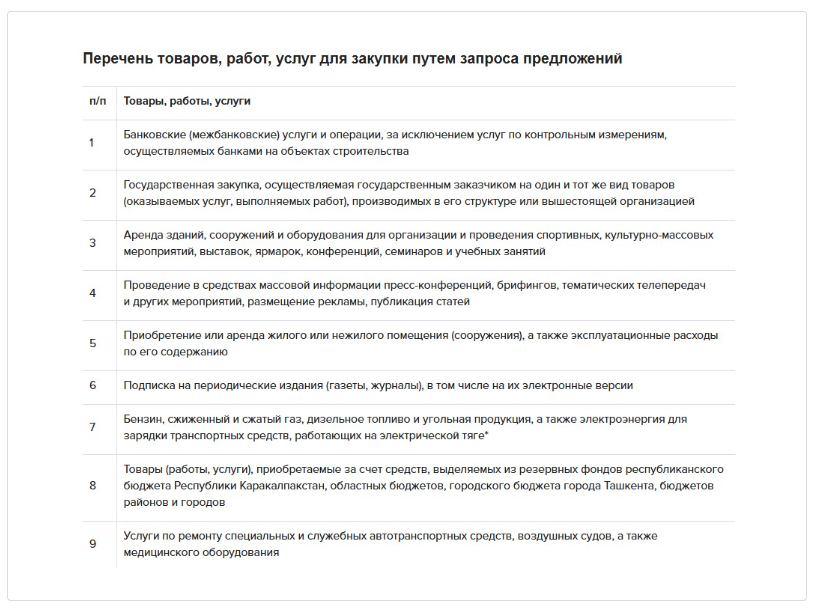 Запрос предложений — конкурентный вид закупок, в котором заказчик размещает объявление в ЭСГЗ и выбирает наиболее оптимальное ценовое предложение. Путем запроса предложений заказчик может закупить 27 отдельных товаров, работ, услуг (Прил. № 1, утв. Указом Президента Республики Узбекистан от 26.12.2025 № УП-259). В их числе такие предметы закупки, как банковские услуги, ГСМ, аренда, ремонт автотранспорта и другие.