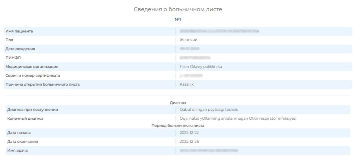 Электронный больничный лист поступает работнику в личный кабинет на портале my.gov.uz. Проверить его можно через сервис «Сведения о больничном листе».