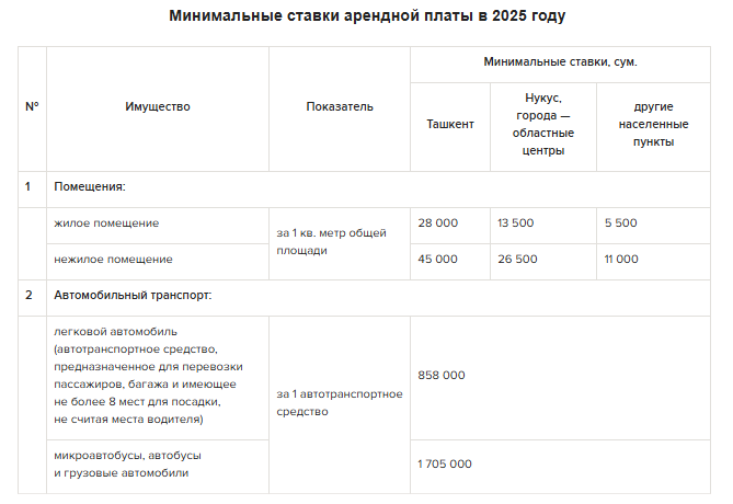 С 2025 года Жокаргы Кенес Республики Каракалпакстан, Кенгаши народных депутатов областей вправе вводить повышающий коэффициент до 2,0 к минимальным ставкам арендной платы по жилым и нежилым помещениям в разрезе районов и городов в зависимости от их уровня экономического развития (ст. 12 Закона от 24.12.2024 №ЗРУ-1011).