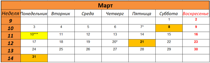 Для тех, кто работает 6 дней в неделю, выходными будут только 21 марта (пятница) и 23 марта (воскресенье), а 22 марта (суббота) — рабочий день.