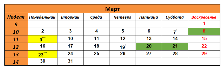 От даты праздника зависит продолжительность выходных и норма рабочего времени за март. Если выходной день совпадает с праздничным нерабочим днем выходной день переносится на рабочий день, следующий после праздничного нерабочего дня (ст. 208 ТК).