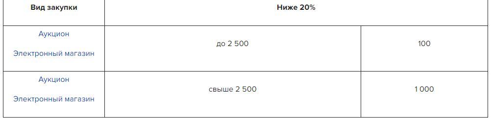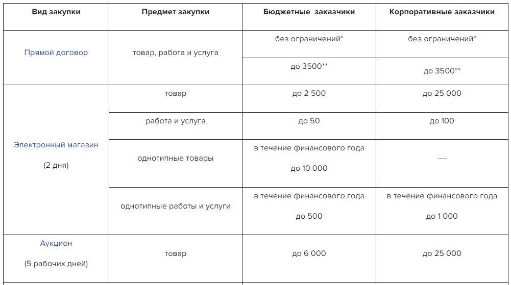В таблице представлены ценовые критерии по видам закупочных процедур в соответствии с Законом
