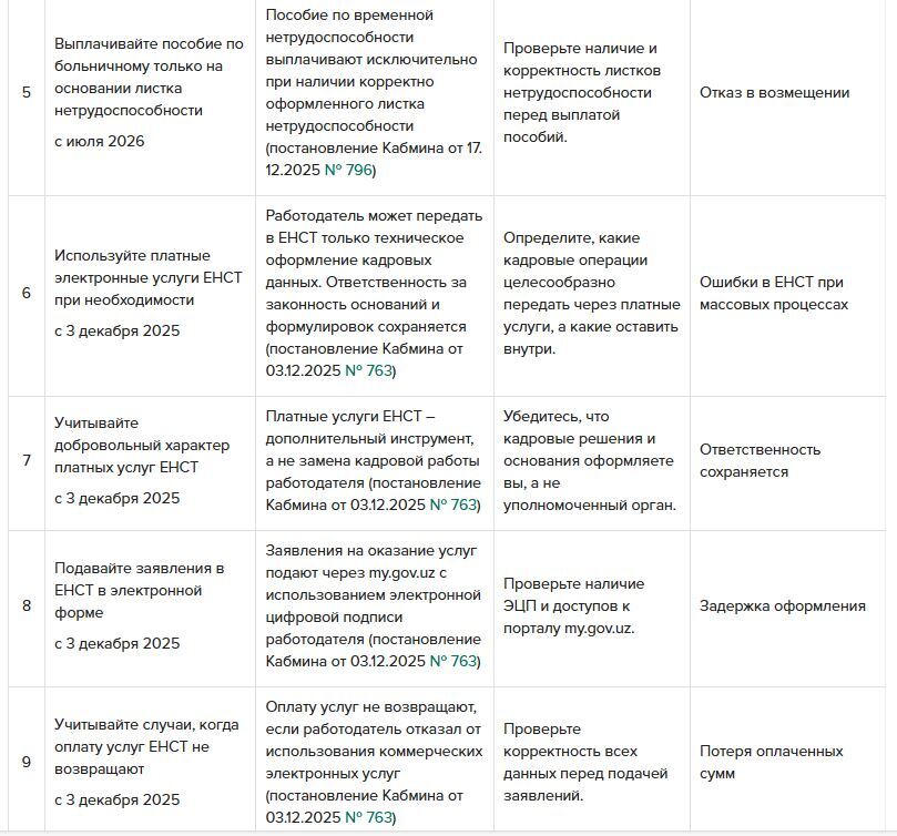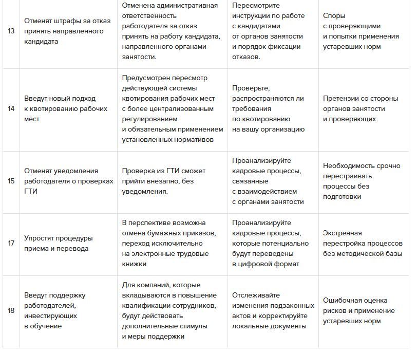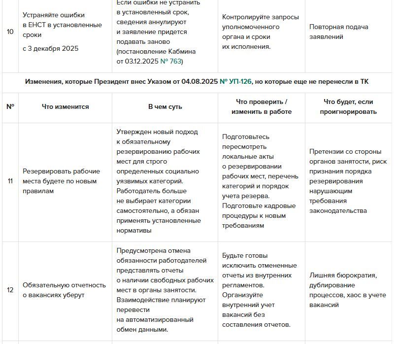 В этой таблице мы собрали все изменения в кадровой работе, которые заработают в 2026 году. Каждое изменение отметили иконками рисков, а также написали, как подготовиться к поправкам и что будет, если их проигнорировать. Изучите таблицу полностью, и будете уверены, что знаете все, что вам понадобится перестроить в работе в новом году. Учтите: некоторые изменения, которые внес Президент своим Указом, еще не внесли в Трудовой кодекс, КоАО и другие нормативные акты.