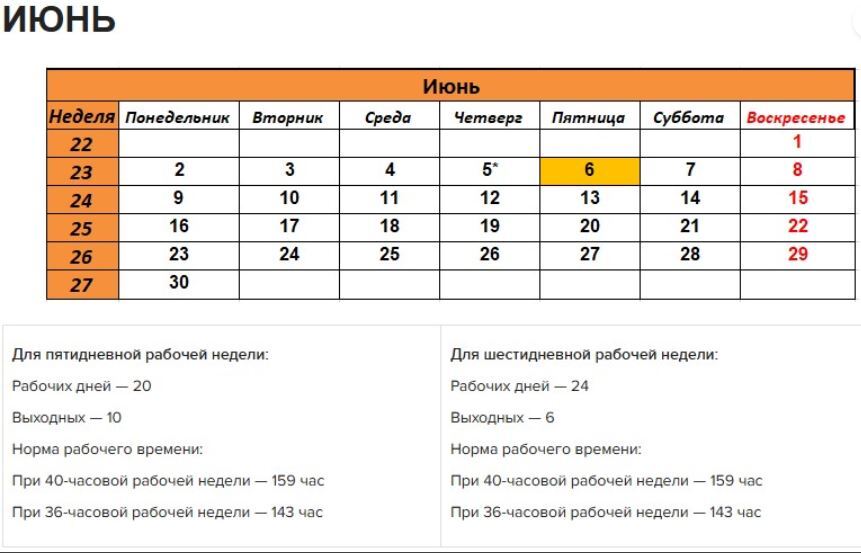– 7 июня, суббота — выходной для 5-дневки, дополнительный выходной для 6-дневки;